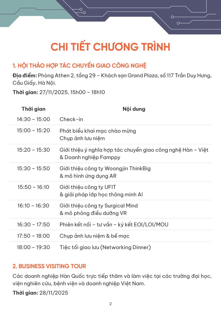 - 28/11/2025: Business Visiting Tour – Các doanh nghiệp Hàn Quốc thăm và làm việc trực tiếp với các trường, viện, bệnh viện và doanh nghiệp tại Việt Nam.
